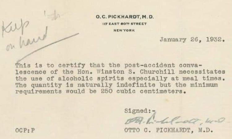 “Η ανάρρωση του Winston S. Churchill απαιτεί τη χρήση αλκοολούχων ποτών, ειδικά κατά τη διάρκεια των γευμάτων. Η ποσότητα είναι αόριστη, αλλά η ελάχιστη απαίτηση είναι 250 κυβικά εκατοστά.”