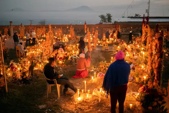 Οι στολισμοί είναι εκθαμβωτικοί: πορτοκαλί μαργαρίτες, πολύχρωμα πετσετάκια, γλυκά κρανία από ζάχαρη και το χαρακτηριστικό pan de muerto, το «ψωμί των νεκρών».